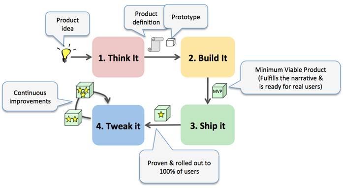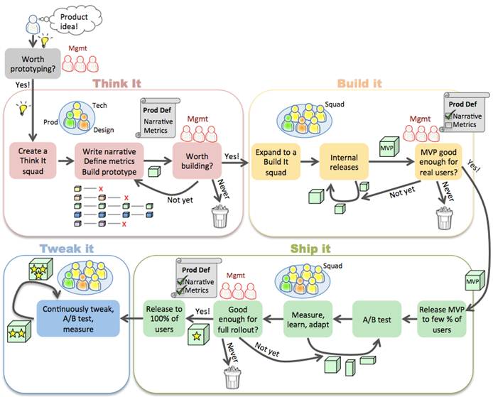 All major product initiatives go through four stages – “Think It”, “Build It”, “Ship It”, and “Tweak It”. Here’s a picture illustrating the flow from idea to product, and what comes out of each stage along the way. You’ll find a more detailed version of this picture at the end of the article.