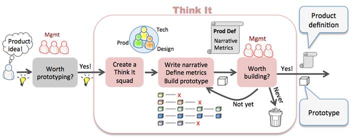 If management agrees that the idea is worth exploring, a small cross-functional “Think It” squad is formed. This typically consists of a developer, a designer and a product owner. Their job is to write a product definition, and build a compelling prototype.