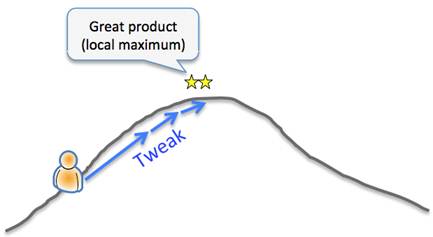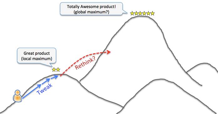 At this point the squad and management will discuss: are we happy being at the top of this hill, or is there a higher peak to be found? In the former case, the squad may gradually move on to other products. In the latter case, the squad may go back to “Think It” to reimagine this product and make a leap for the global maximum (or at least a higher peak…).